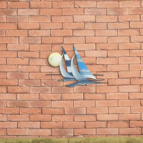 A pair of sailboats riding the wind under a brilliant sun. Hand painted with rich vibrant colors. The perfect addition to any nursery, bedroom or outdoor space. Metal hooks on back for easy display.