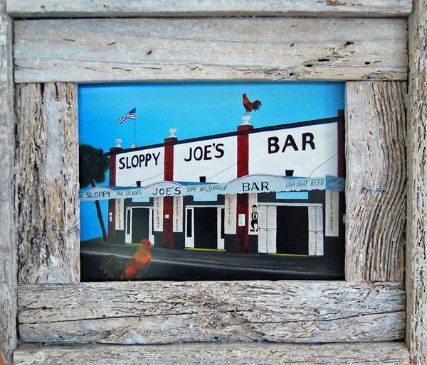 This is the famous bar on Duval street, Key West. In Key West, you actually see roosters on Duval Street by Sloppy Joe's. All prints are signed by Nadine and come in one of our white wash lobster trap frames.