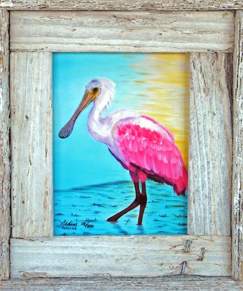 One of the most spectacular and unusual birds we have here in the Florida Keys. We see them on occasion and love it every time. Their bill is very different and is shaped like a spoon, hence the name Roseate Spoonbill. Nadine has captured this magnificent bird wading in one of our Florida Bay flats. Her attention to detail if great. Definitely one of her best bird paintings. All prints are signed and numbered by Nadine.